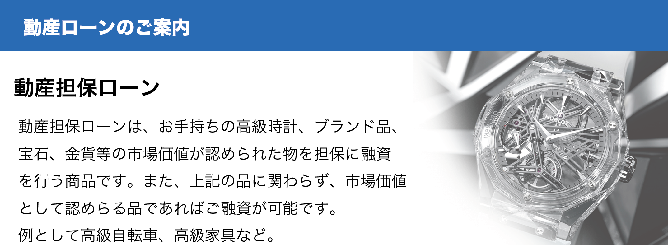1.動産品はお預かりが融資条件となります。 2.高級時計、ブランド品は証明ができる証書が無いとご融資が出来ない場合がございます。 |