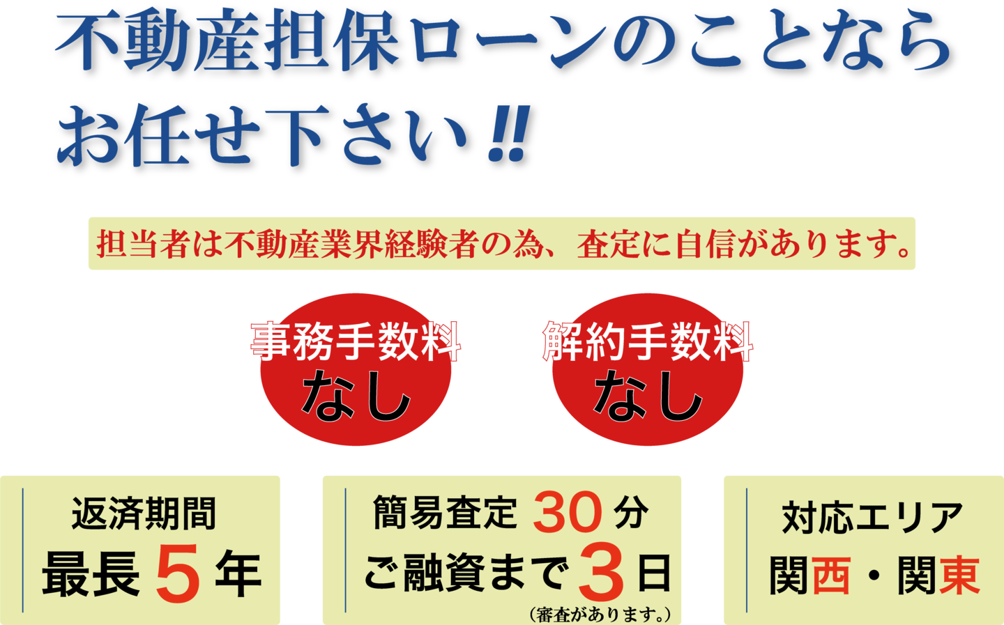 SERVICE / 商品案内 抱える課題に対して、最適な提案を行い、一気通貫サポートします。 不動産担保ローン 融資額500万円~15億円まで年利 5.0%~15.0%最短3日で融資が可能です。※用途不問、ビル、土地、ラブホテル。 買取再販ローン(区分マンション専門) 融資額8,000万円(原則)年利 2.98%~8.0%最短3日で融資が可能です。※取得費用からリフォーム費用まで、利息後払い可能。